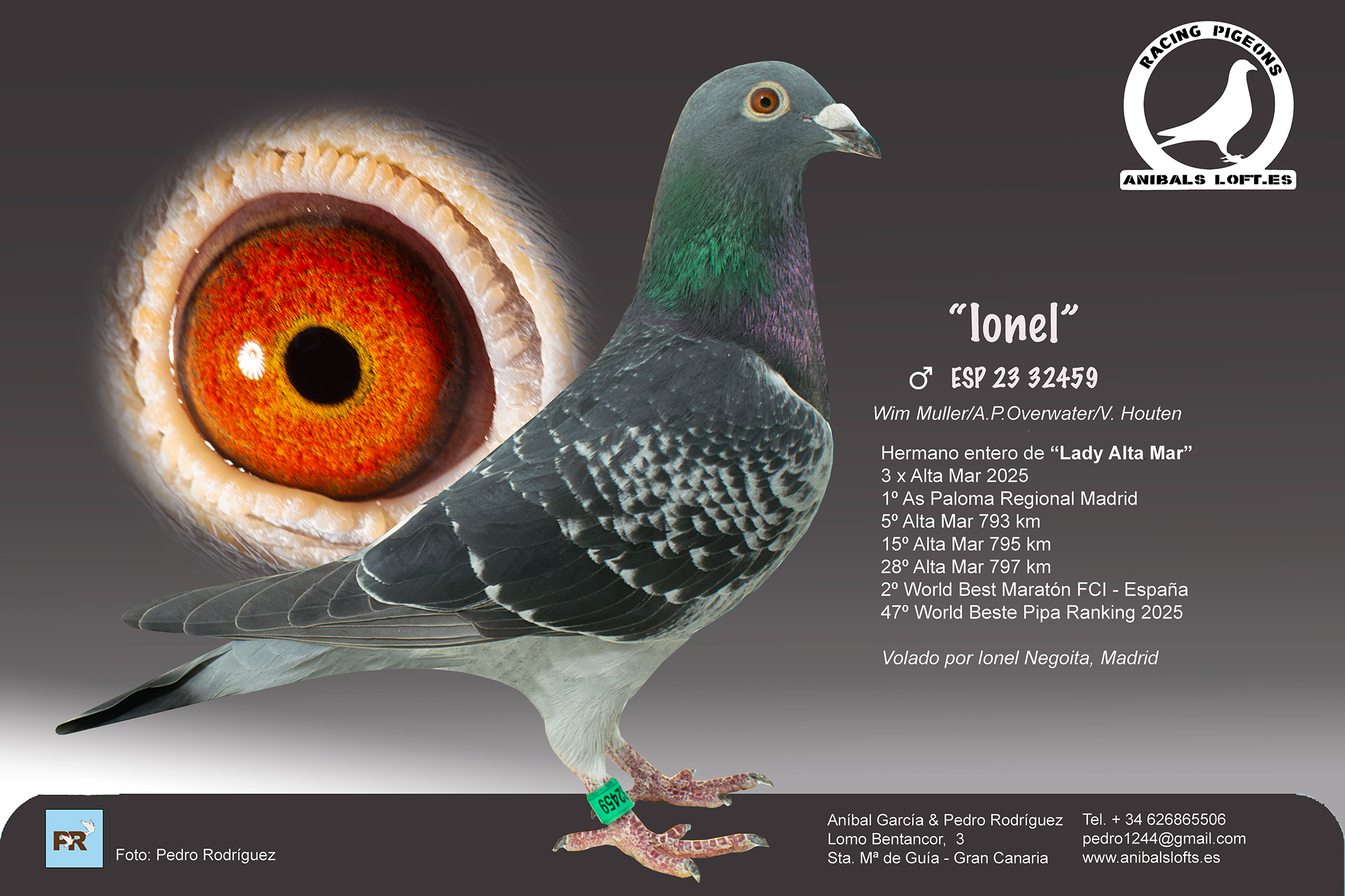 En el palomar, tenemos varias palomas donde las líneas Overwater están representadas. En 2025, adquirimos un macho del palomar de Ionel Negoita, rumano residente en Madrid que, en el pedigrí por parte de la madre, es un cruce entre Overwater x van Houten.